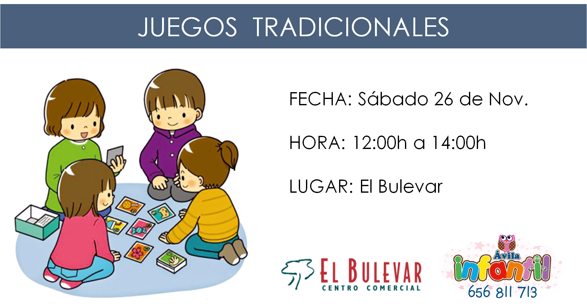 No te pierdas este sábado 26 de Noviembre una tarde de juegos tradicionales con Ávila infantil y El Bulevar. Diversión asegurada.